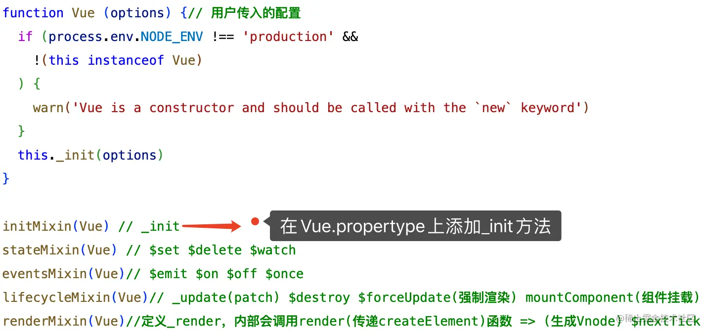 initMixin 方法为Vue添加了 _init 方法,在new Vue的时候会执行该方法,稍后重点分析。