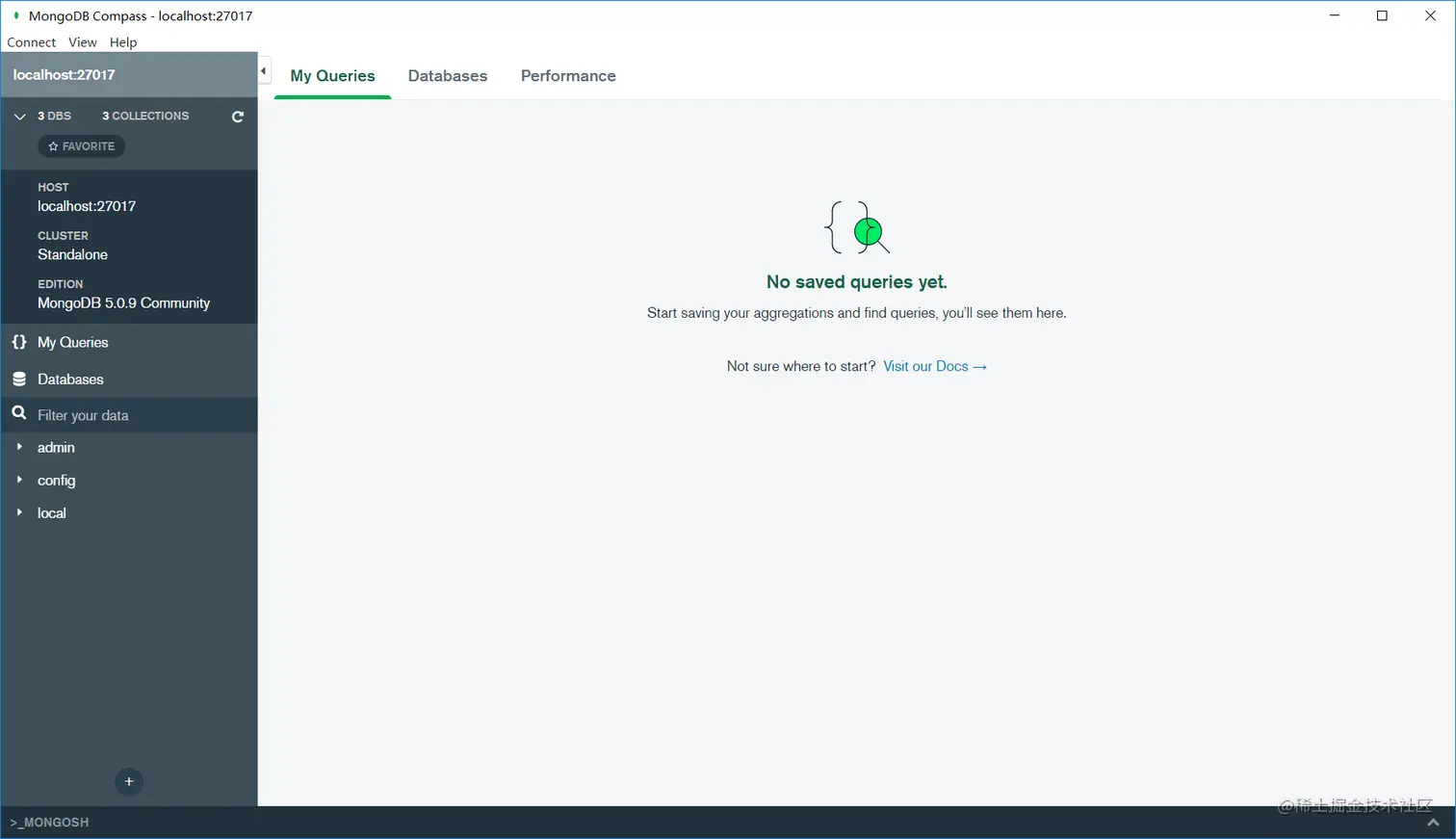 - 打开 MongoDB Compass 工具,如下所示,在这里可以执行MongoDB命令