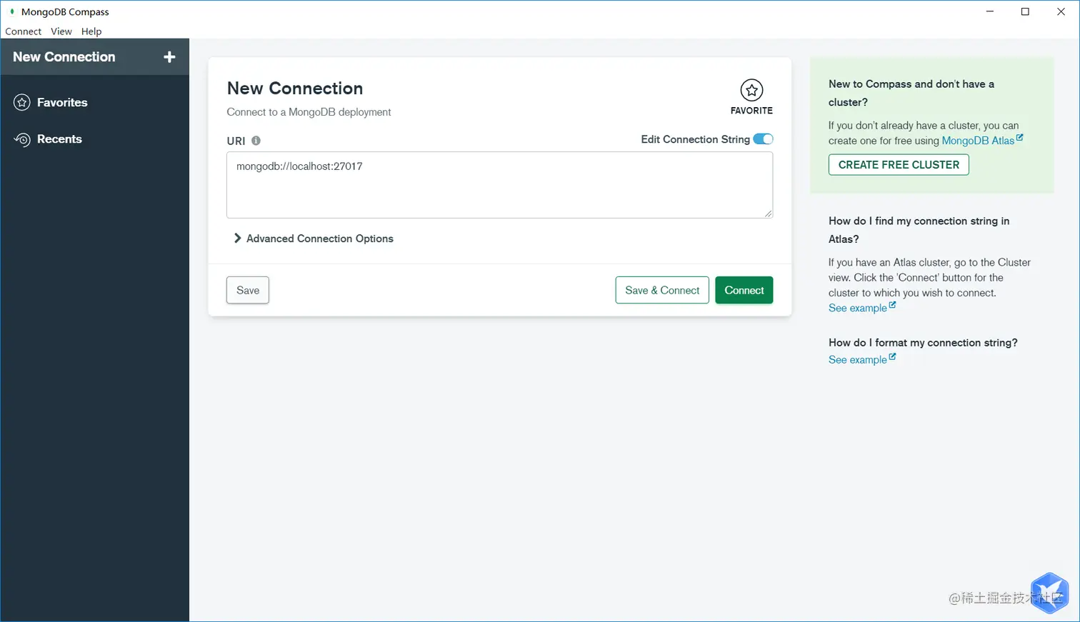 - 使用MongoDBCompass连接mongodb,mobodb监听的端口是27017,如图所示: