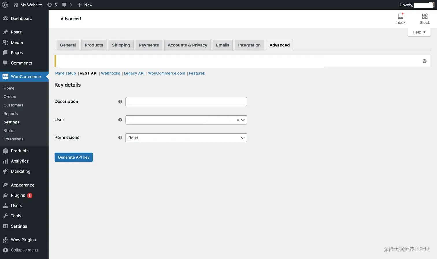 首先,你需要登录到你的WooCommerce实例,然后进入WooCommerce > Settings > Advanced > REST API: