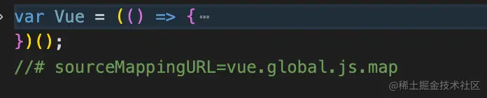 因为引入的 vue.global.js 是一个打包生成的产物,所以真正的源码不在这。