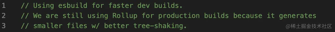 根据这段注释可以,vue3 在构建开发环境时,使用的是 esbuild,而在进行生产环境打包时,使用的是rollup(但是笔者只会 🤏webpack,不过这没问题,因为这些项目构建工具在使用的大致思想上都差不多)。