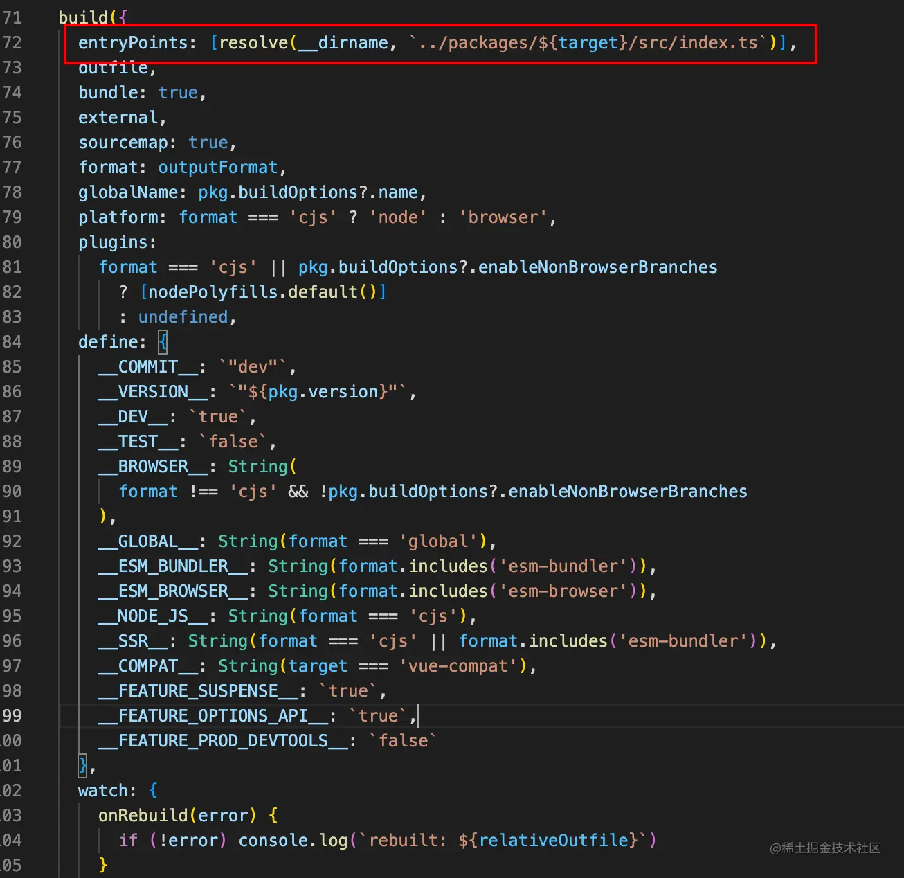 看一下 esbuild 的配置信息,实际上的入口文件就是:
