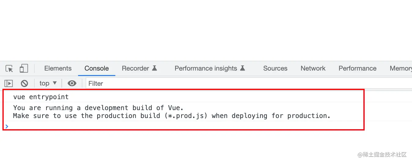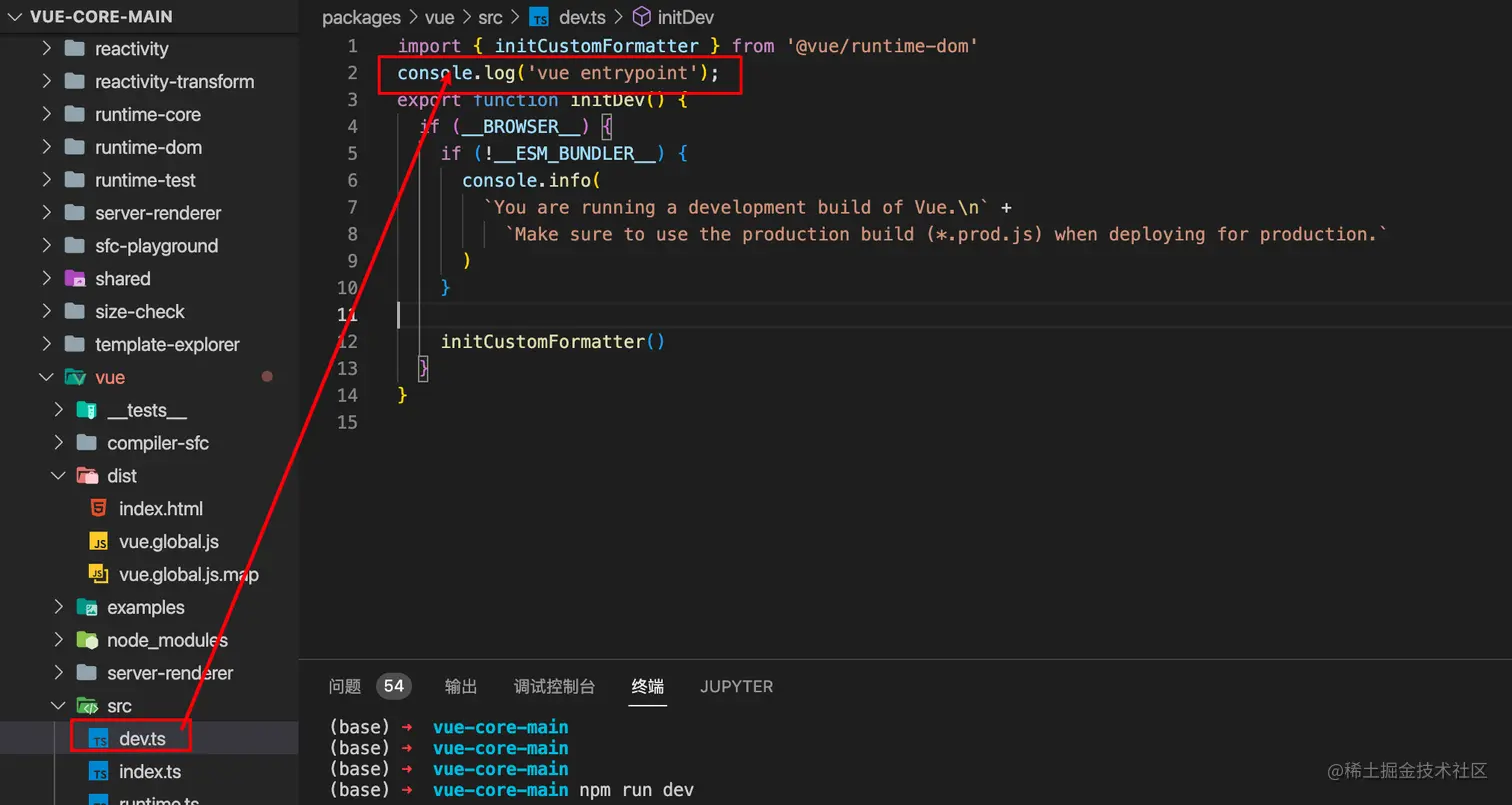 就跳转到了dev.ts文件中,我们加上测试语句:vue entrypoint ,因为 esbuild 支持热更新,所以当文件更新后,这句话也会立即打包到 vue.global.js 文件中,并在浏览器中打印。