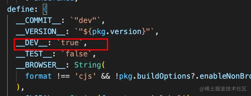 很明显,**DEV 这个变量表示当前环境是否为开发环境,在上一节的 esbuild 的配置中也有体现。**