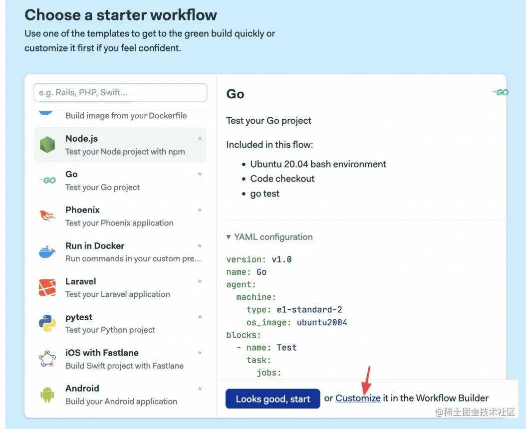 - 选择Go starter工作流程,点击Customize。