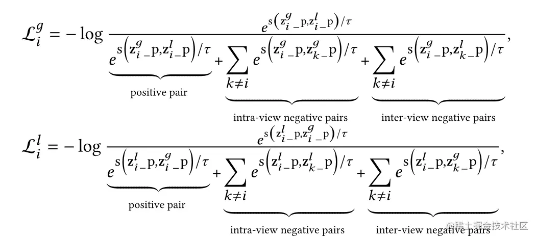 注意,负样本有两个来源,分别为视图内节点和视图间节点,对应于公式分母中的第二项和第三项。
