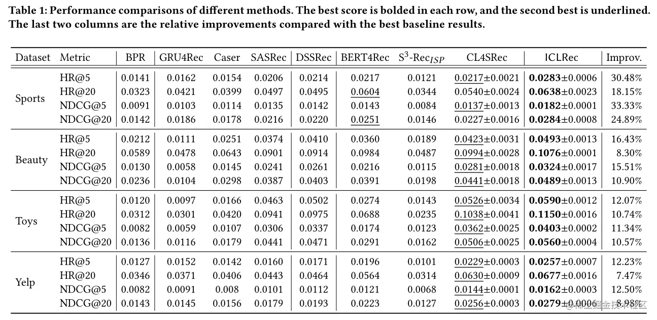 可以看出,ICLRec在所有数据集上始终优于现有方法。与最佳baseline相比,HR和NDCG的平均改善率在7.47%到33.33%之间。