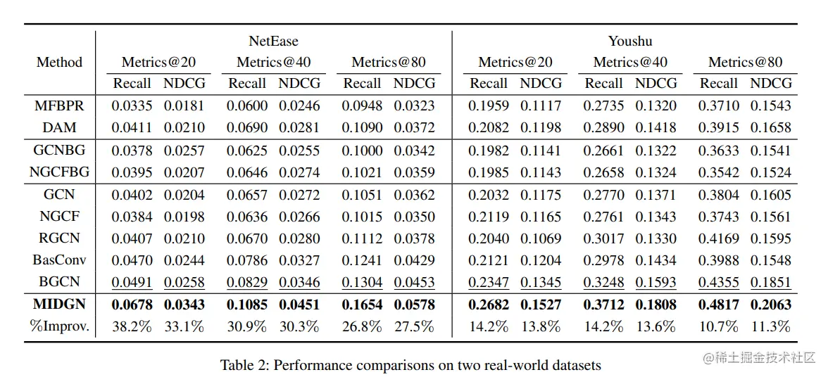实验在两个数据集上进行,效果很好,MIDGN在NetEase数据集上将性能提高了26.8%-38.2%,在Youshu上提高了10.7%-14.2%。