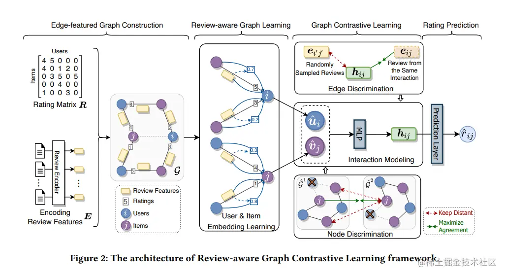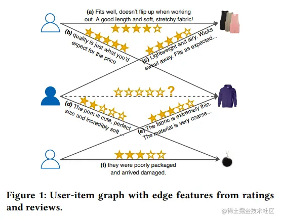 具有特征边的图构建:从Figure 2中的图构建部分我们可以看到,用户物品交互评分矩阵R与评论E组成用户物品交互ε={R,E},而基于评论的推荐数据表示为具有特征边的二部图G=⟨U∪V,E⟩。