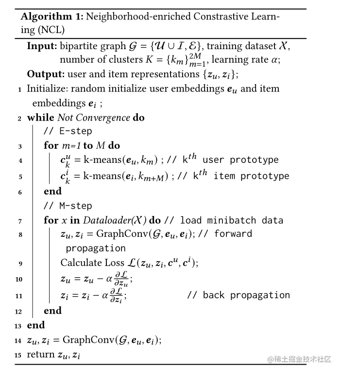 怎么识别具有相同语义的节点呢?我们认为相似的节点倾向于落在临近的embedding空间中,而我们的目标就是寻找代表一组语义邻居的中心(原型)。因此,我们对节点embedding应用聚类算法去获取用户或物品的原型。