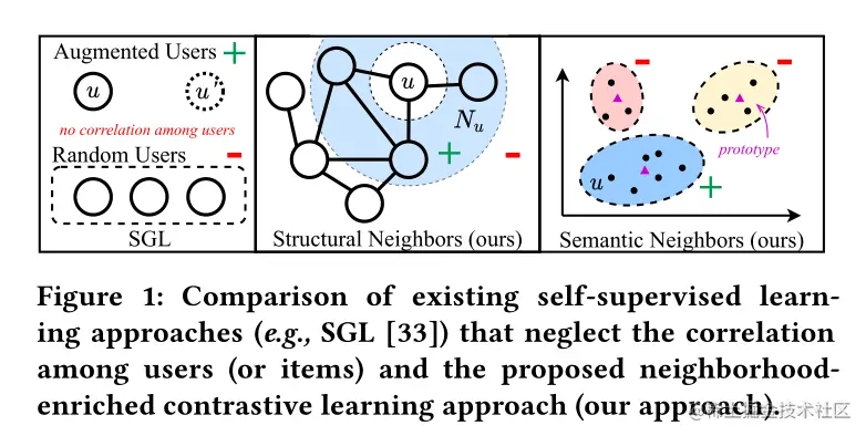构建基于节点语义关系的对比学习任务:将每个用户(物品)与它具有相似语义关系的节点进行对比。这里具有语义关系指的是,图上不可到达,但具有相似物品特征、用户偏好等的节点。