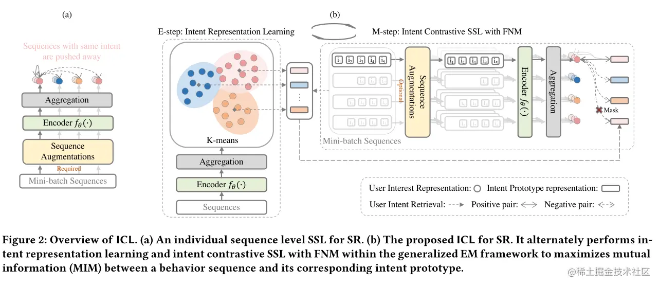 正是因此,我们必须重视不同用户购买序列之间的潜在意图关系。文章提出的一个良好的解决方案是,我们从未标记的用户行为序列中学习用户的意图分布函数,并使用对比学习优化SR模型。具体来说,我们引入一个潜在变量来表示用户的意图,并通过聚类学习潜在变量的分布函数。