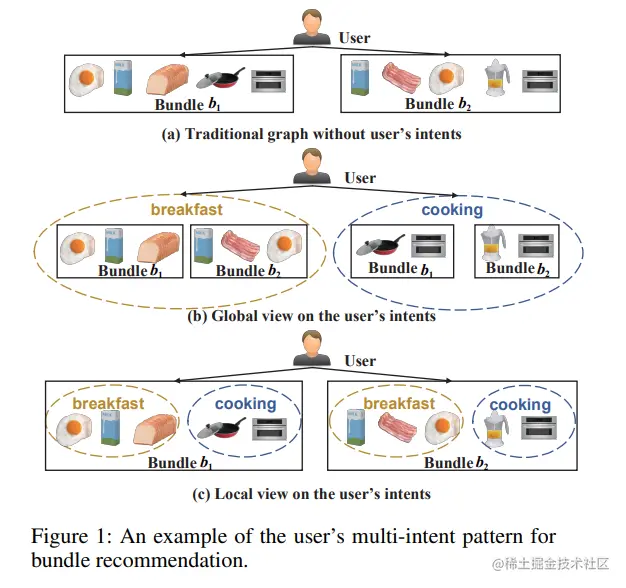 该模型将DGCF的解耦思路用在了bundle推荐,从全局(解耦bundle间的用户意图)和局部(解耦bundle中的用户意图)两个视图对用户意图进行解耦,并采用InfoNCE加强学习效果。下图可以形象地解释上述两个视图~