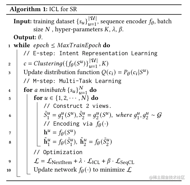 为了学习意图分布Q(c),利用编码器将序列得到表示{hu}u=1∣U∣,并在学习到的表示上进行k-means聚类,从而得到Pθ(ci∣Su)。