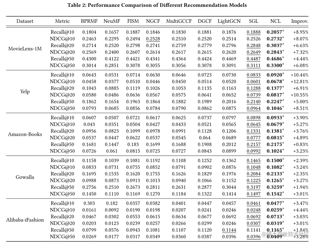 论文的实验结果可以说是很震撼一张大表······但结果属实不错,在五个数据集上的结果证明NCL的有效性,尤其是在Yelp和Amazon book数据集上,与其他模型相比,性能分别提高了26%和17%。