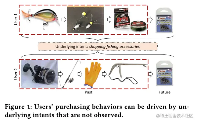 以下图作引,我们直观理解这篇文章的思想。Figure 1中展现了两个用户的购物序列,尽管没有出现一样相同的商品,但是他们最后却购买了同样的物品。原因很简单,因为他俩同为钓鱼爱好者,购买意图冥冥中含有不可言说的关系。