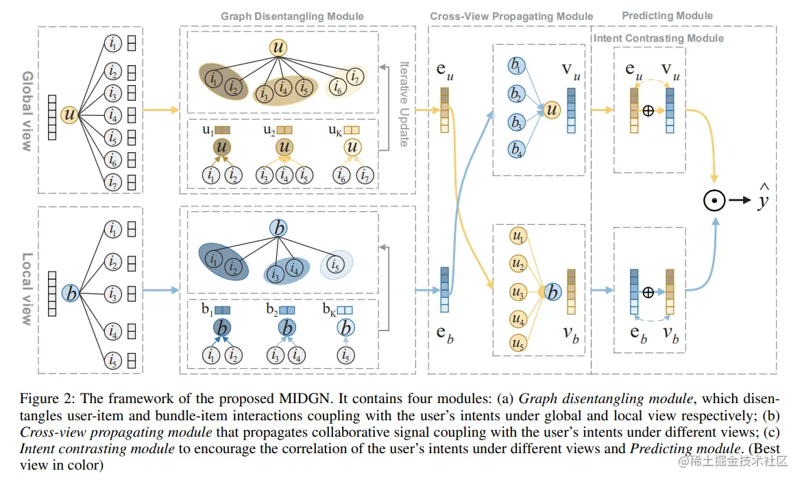 从图中可以看到,MIDGN由四个不同的模块组成:图解耦模块、 视图交叉传播模块、意图对比模块和预测模块。