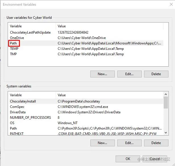 环境变量窗口将打开,你必须选择或双击变量Path。