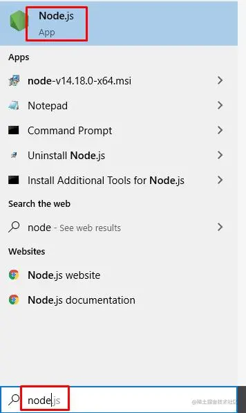 你可以通过在位于windows 10左下角的搜索栏中搜索node 来找到Node.js的路径。