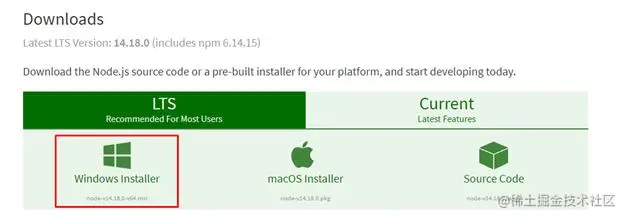 要正确安装Node.js,请打开你喜欢的浏览器并访问Node.js的官方网站。点击下面截图中显示的windows安装程序。