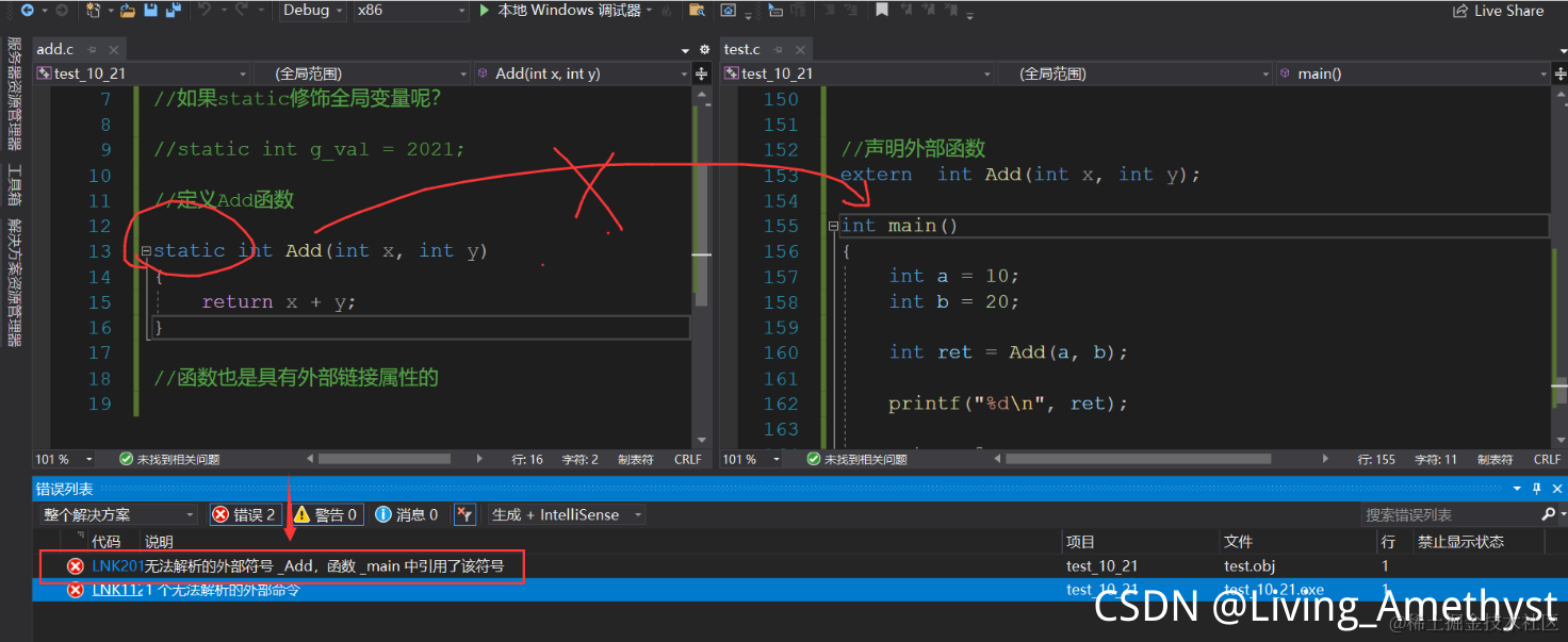 由图可见,static修饰函数时,函数由外部链接属性变为了内部链接