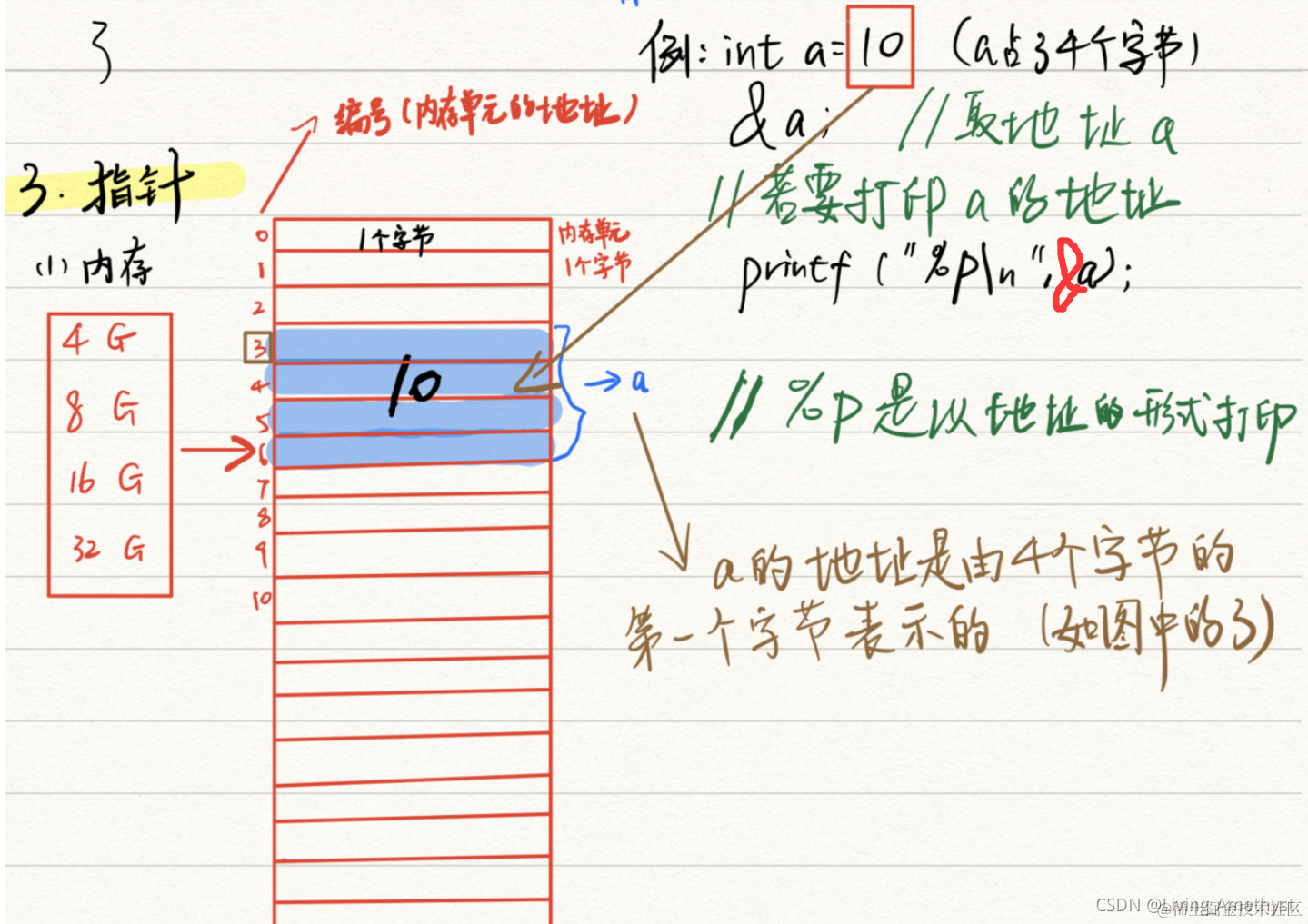 如图中的 int a =10;这里的a占4个字节,就要在内存中找到4个字节再把这个10存进去,至于怎么存,后期再详细讲。