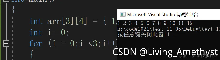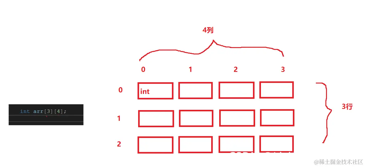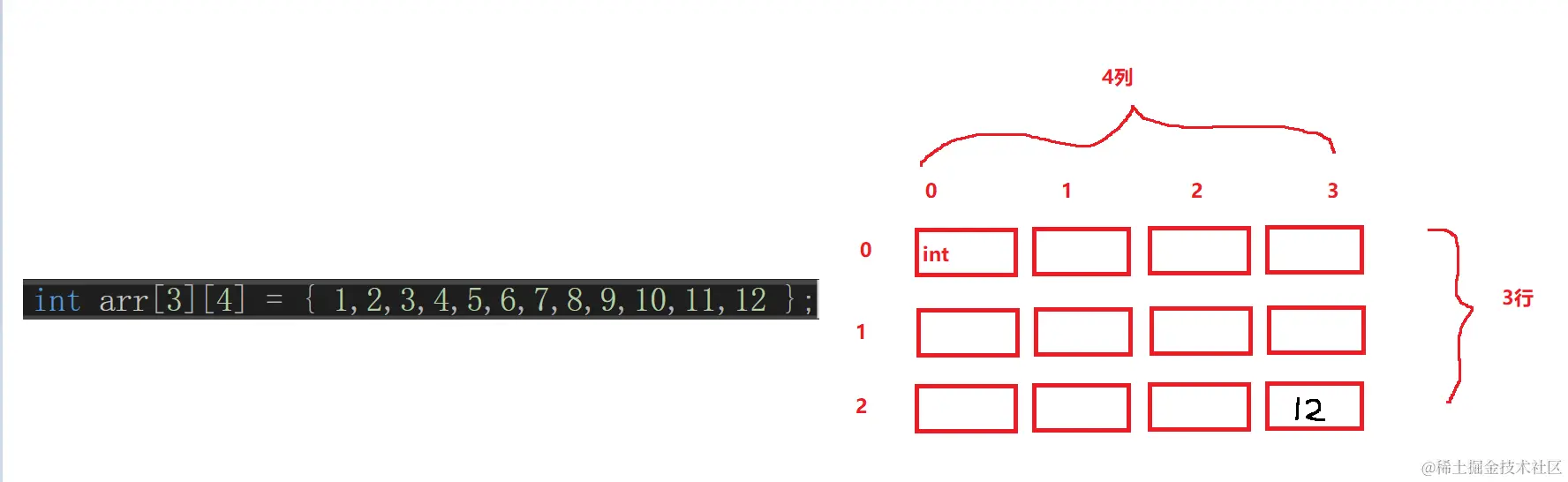int arr[3][4] = {1,2,3,4,5,6,7,8,9,10,11,12};//这样初始化是先放满一行再往下一行放