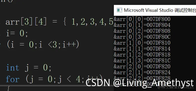 可以清楚的看到,每两个相邻的元素的地址还是都相差4,第一行的最后一个和第二行的第一个也是如此,由此我们得到结论 :二维数组在内存中也是连续存储的。