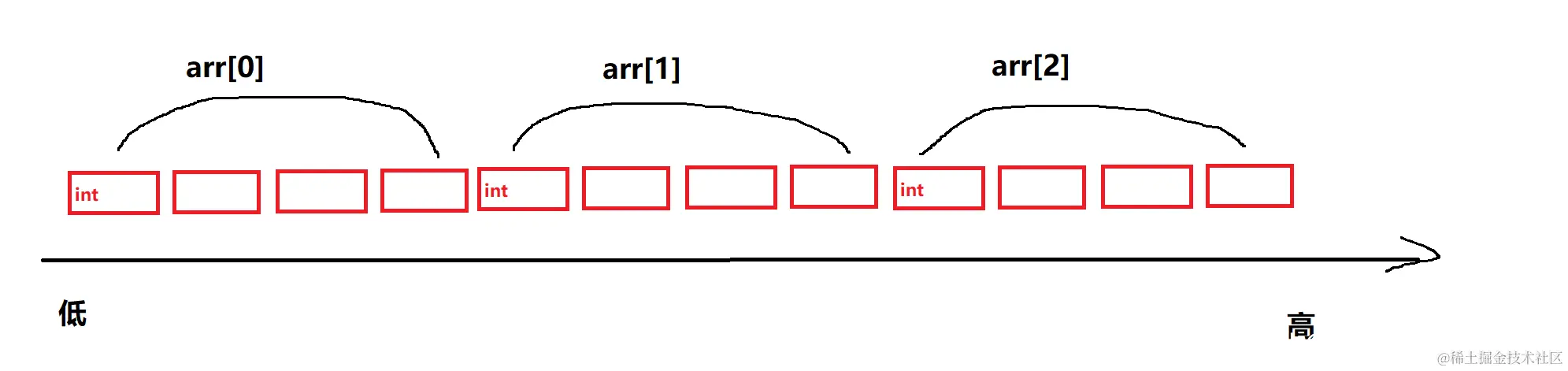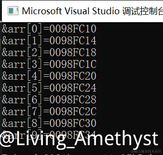 仔细观察输出的结果,我们知道,随着数组下标的增长,元素的地址,也在有规律的递增。我们发现数组中的相邻的两个元素的地址都相差4,而一个整型元素的大小是4个字节, 由此可以得出结论:数组在内存中是连续存放的。