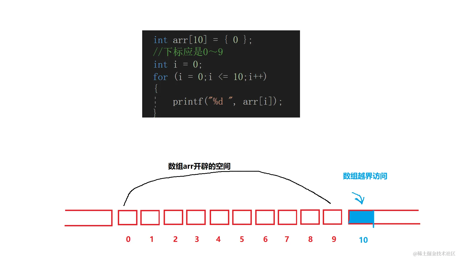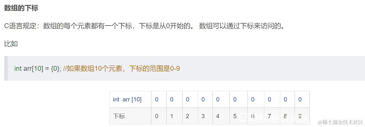- C语言本身是不做数组下标的越界检查,编译器也不一定报错,但是编译器不报错,并不意味着程序就是正确的,所以程序员写代码时,最好自己做越界的检查。