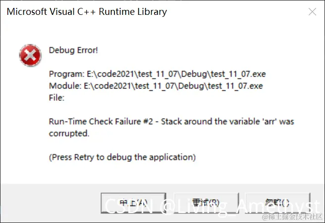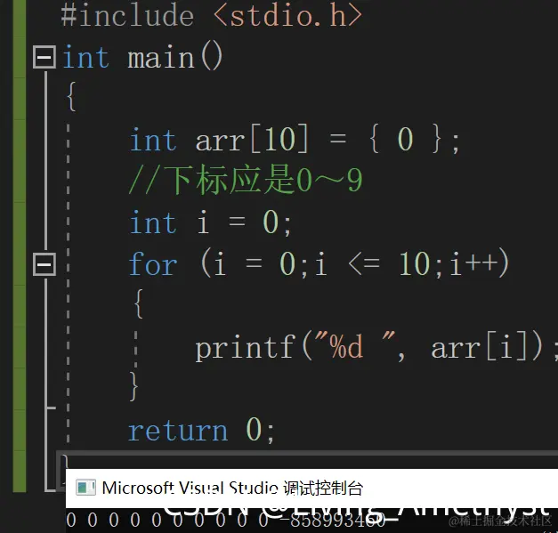 这就是典型的越界访问了,数组arr的下标的范围是0~9,但是我这里写的是i<=10,