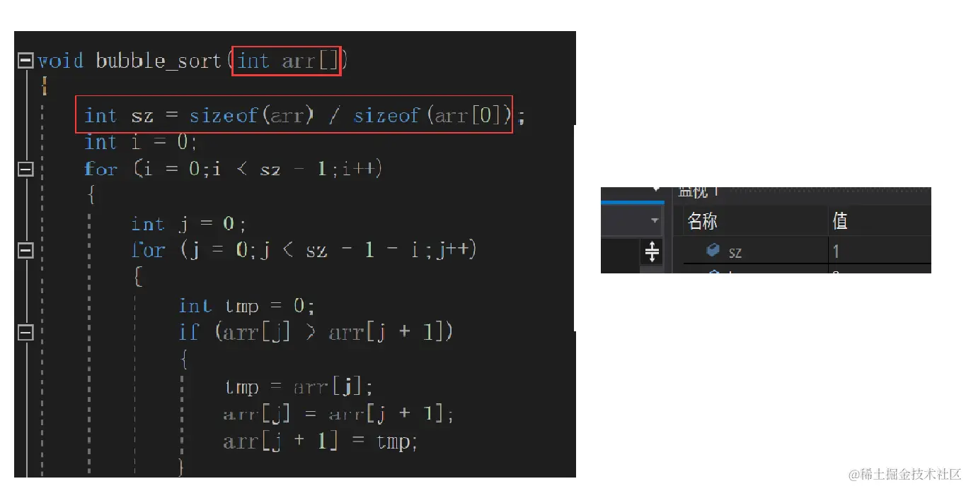 sz应该是等于sizeof(arr) / sizeof(arr[0])= 40/ 4=10的,而这里等于1,这是为什么呢?