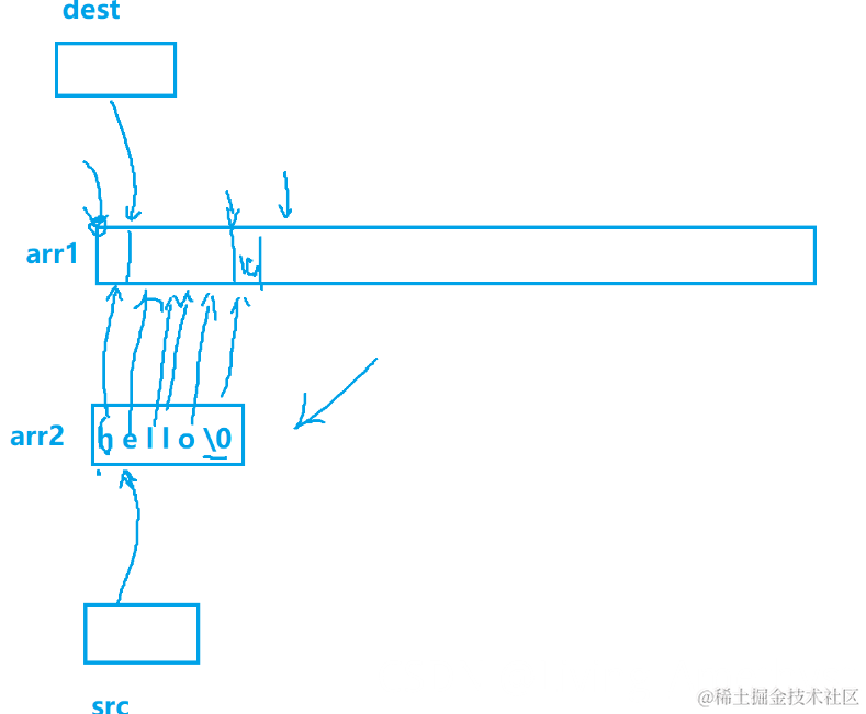 我们可以发现,这个strcpy函数就是通过将arr1数组的内容改为arr2数组的内容,我们还可以发现,这个函数是能拷贝'\0' 的