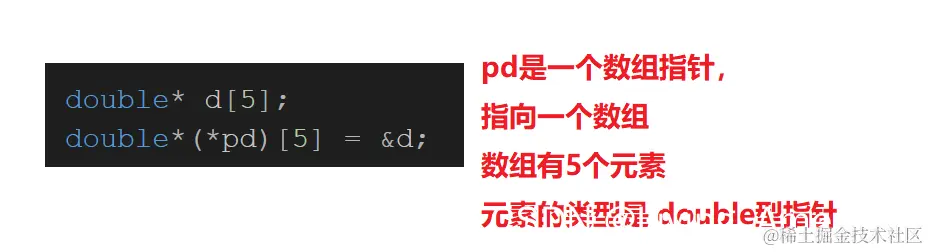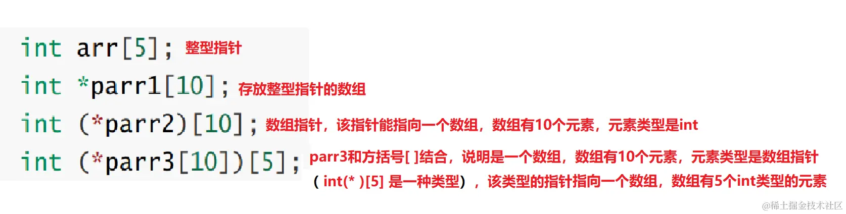 //解释:p先和*结合,说明p是一个指针变量,然后指着指向的是一个大小为10个整型的数组。所以p是一个指针,指向一个数组,叫数组指针。
