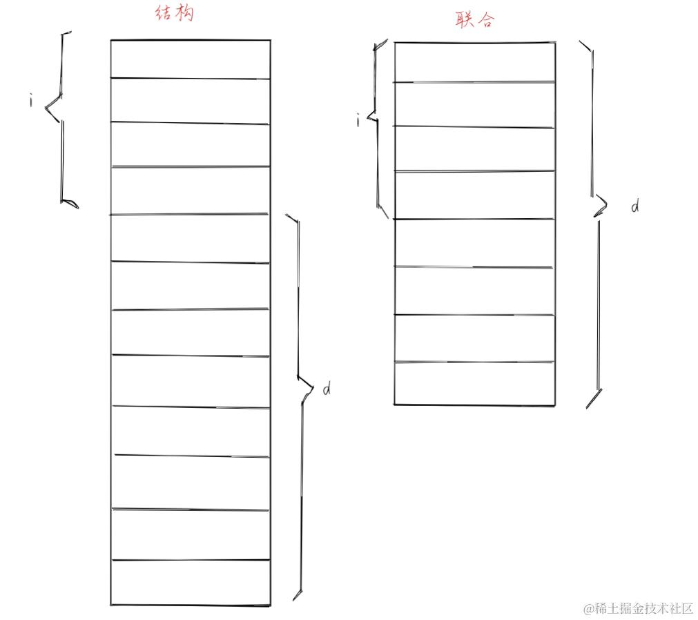 事实上,结构变量s和联合变量u只有一处不同:s的成员存储在不同的内存地址中,而u的成员存储在同一内存地址中。下面是s和u在内存中的存储情况(假设int类型的值要占用4个字节内存,而double类型的值要占用8个字节)