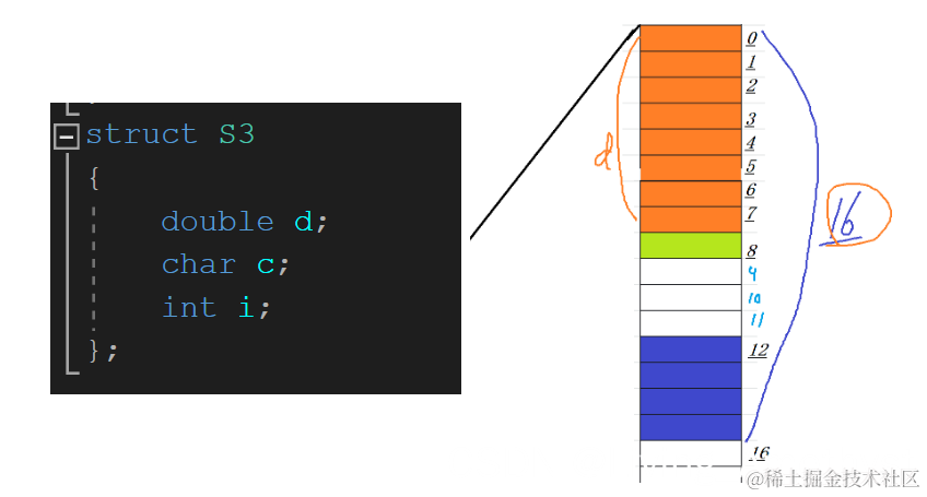 在结构变量s中,成员i和d占有不同的内存单元。s共占用了12个字节