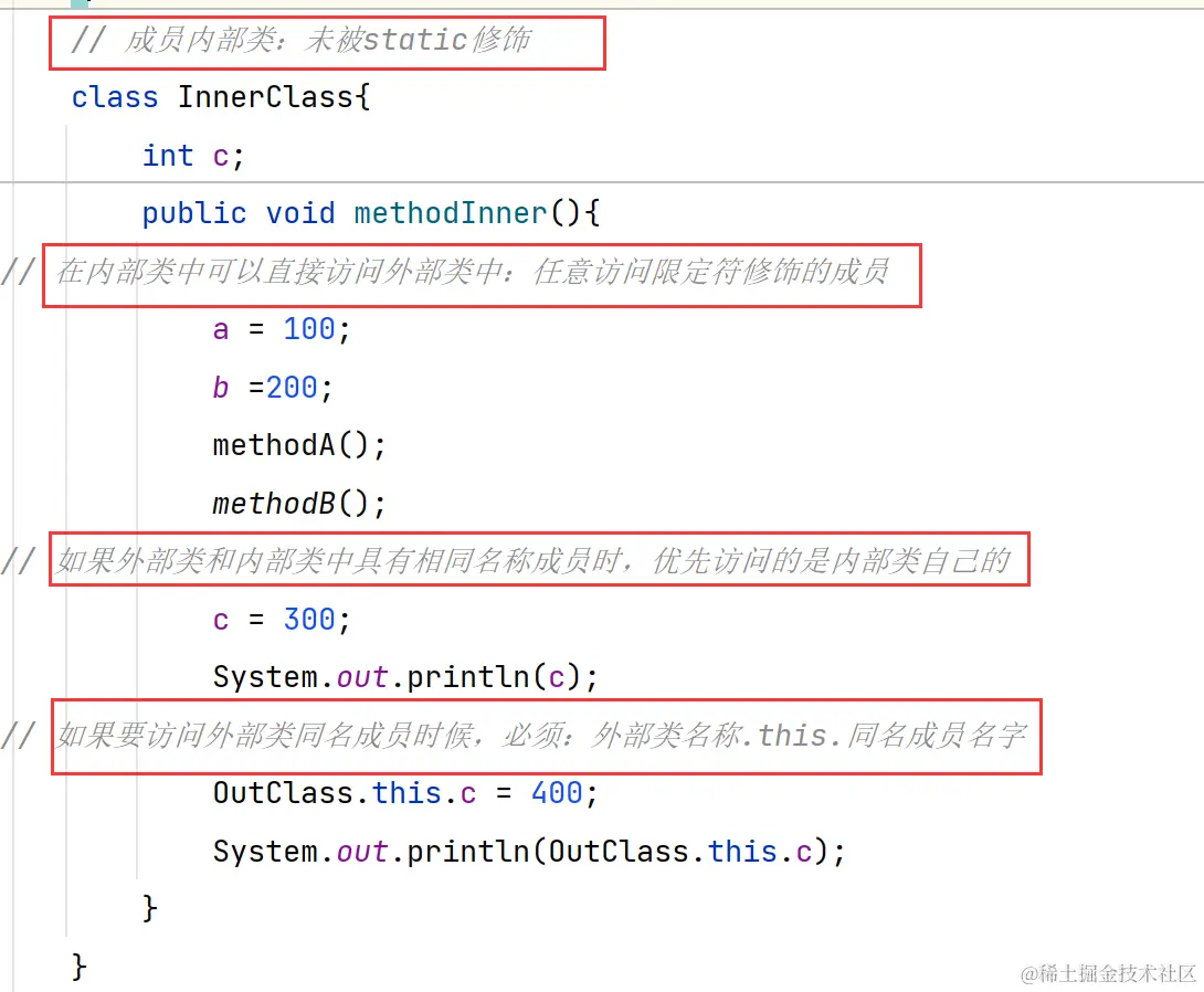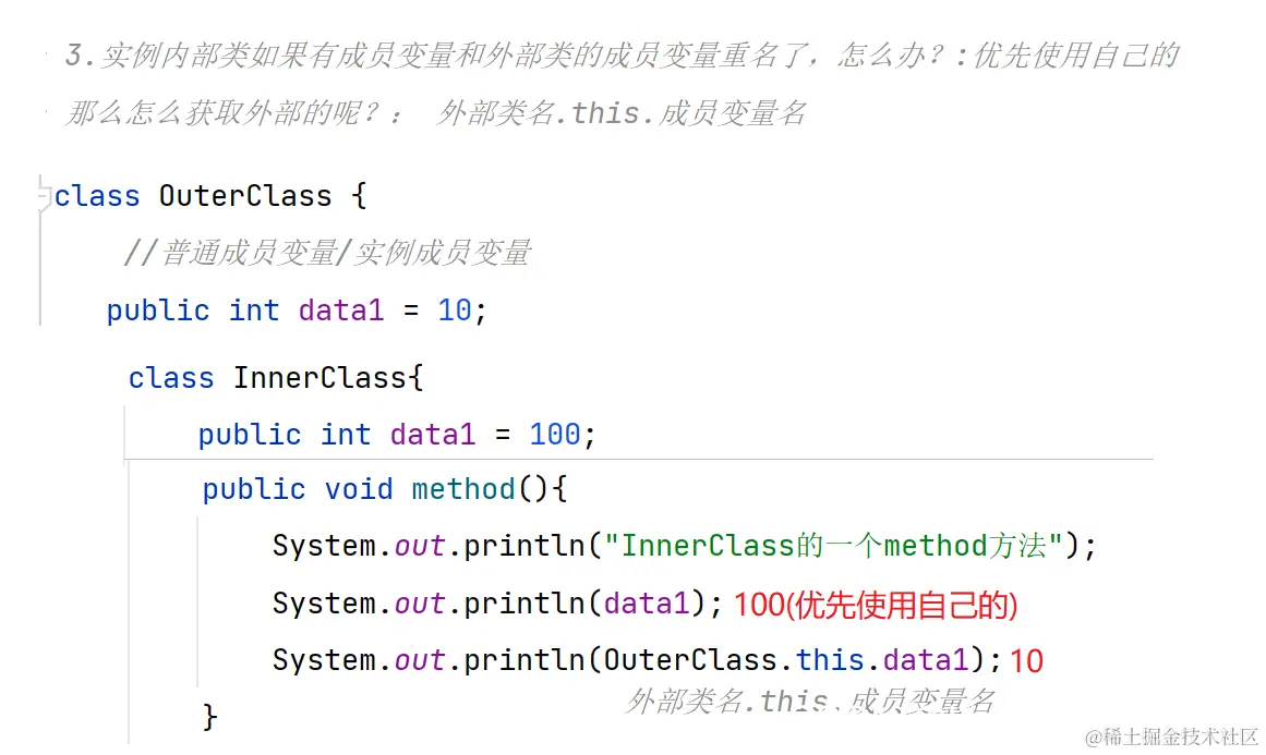 3. 在实例内部类方法中访问同名的成员时,优先访问自己的,如果要访问外部类同名的成员,必须:外部类名称.this.同名成员 来访问