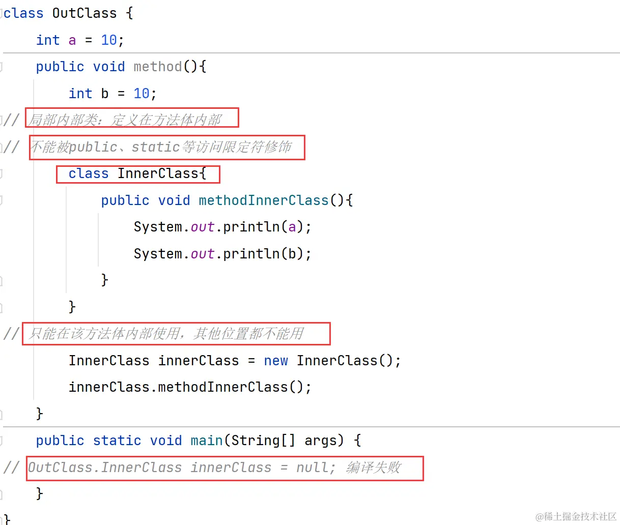 定义在外部类的方法体或者{}中,该种内部类只能在其定义的位置使用,一般使用的非常少,此处简单了解下语法格式