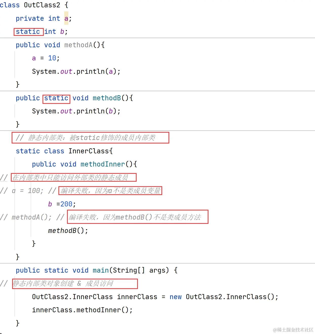 1. 在静态内部类中只能访问外部类中的静态成员