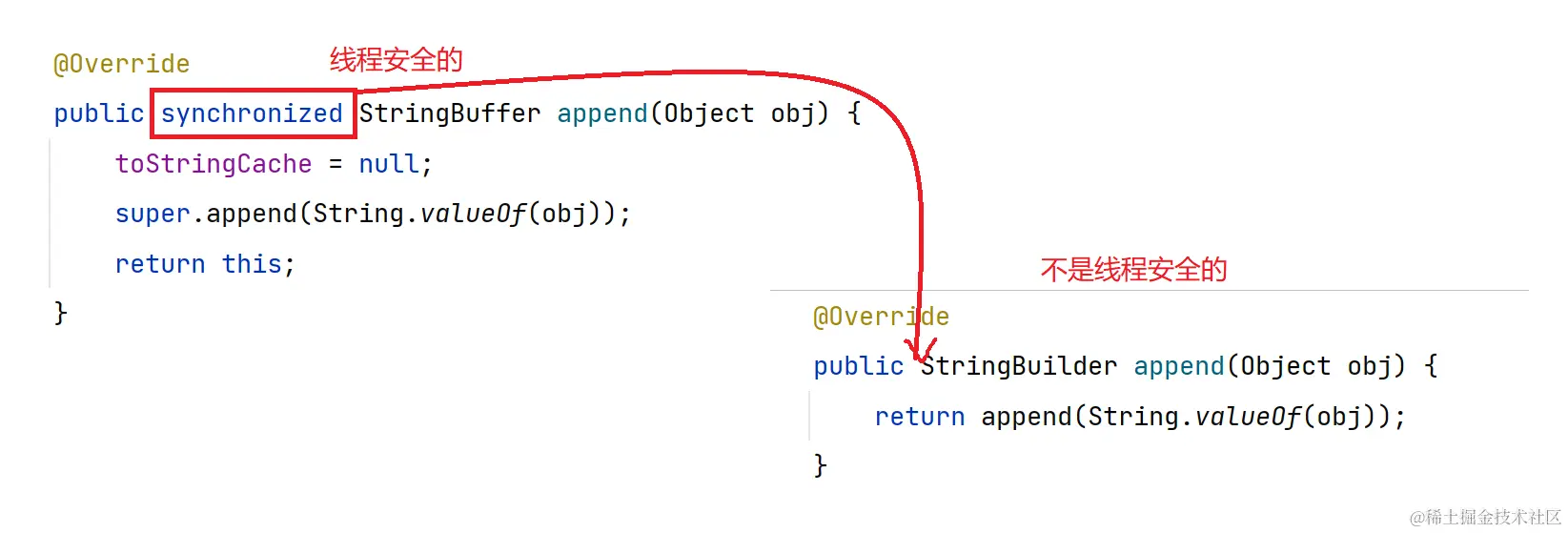 - StringBuffer采用同步处理,属于线程安全操作;而StringBuilder未采用同步处理,属于线程不安全操作
