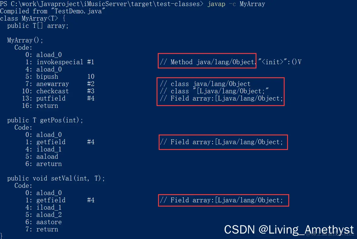 通过命令:javap -c 查看字节码文件,所有的T都是Object。