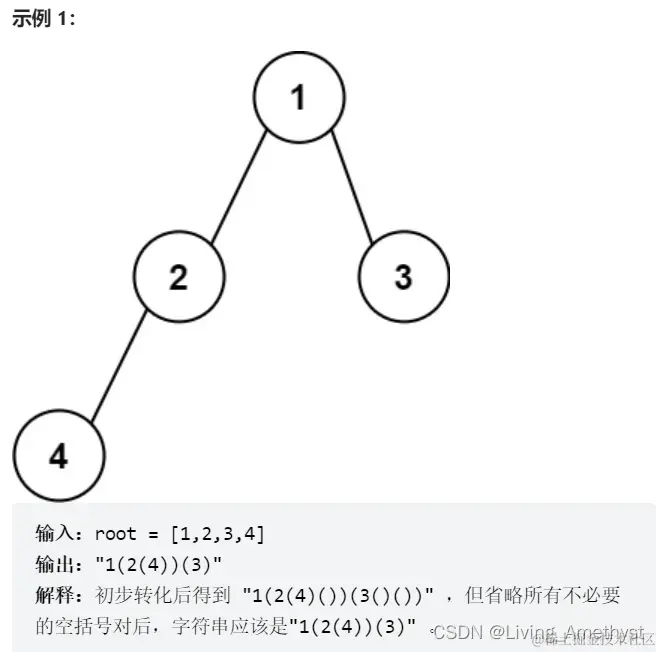 空节点使用一对空括号对 "()" 表示,转化后需要省略所有不影响字符串与原始二叉树之间的一对一映射关系的空括号对。