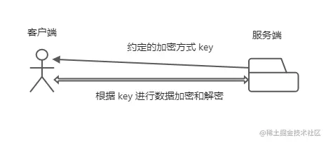 根据对称加密,我们可以得到 HTTP 加密的加密方式和过程,服务端向客户端发送一个加密方式,双方约定以什么方式进行加密,客户端将 key 保存,在之后的双方通信过程中,对所有的信息都以这个 key 进行数据加密和解密。