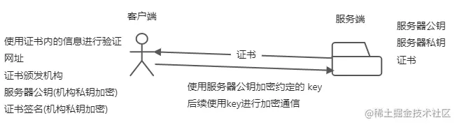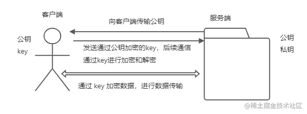 在进行数据传输之前,服务端会向客户端发送 公钥,这个公钥用于服务器使用 私钥加密的信息 进行解密 操作。但是 私钥 只存储于服务端,那么服务端向客户端传输的 公钥加密信息就无法解密,这样客户端就无法解析到服务端传输的加密的信息。为了解决无法通信的状况,在 约定公钥 之后,客户端会向服务端发送一个通过公钥加密的 key ,这个 key 用于后续信息传输加密。服务端和客户端使用 key 加密传输的数据,可以进行正常的数据通信。