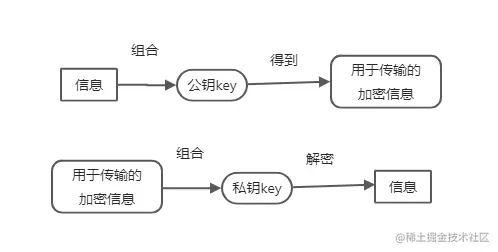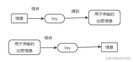 加密过程:要传输的信息和key一起经过算法组合在一起,生成一个加密的信息,这个加密信息用于传输