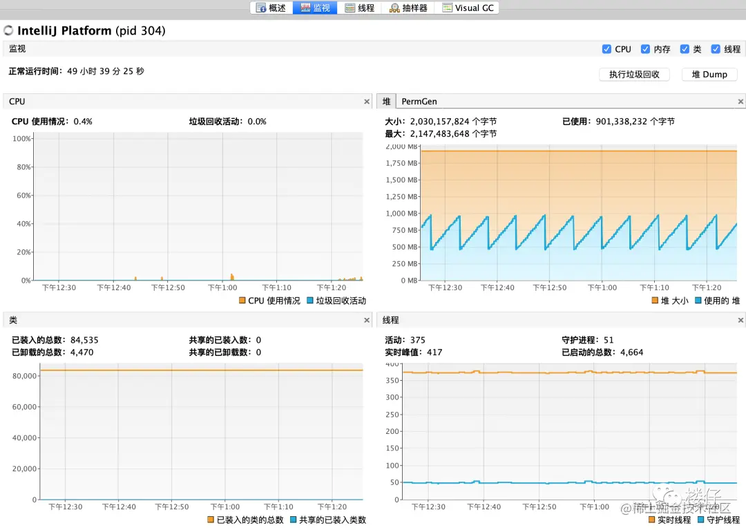 概览:包括堆内存使用情况、线程、类、CPU使用情况四项信息的曲线图。