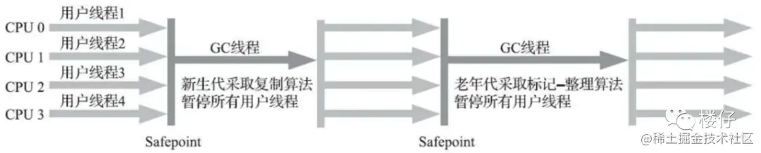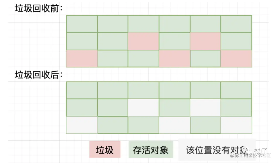 标记--整理算法算是一种折中的垃圾收集算法,在对象标记的过程,和前面两个执行的是一样步骤。但是,进行标记之后,存活的对象会移动到堆的一端,然后直接清理存活对象以外的区域就可以了。这样,既避免了内存碎片,也不存在堆空间浪费的说法了。但是,每次进行垃圾回收的时候 ,都要暂停所有的用户线程,特别是对老年代的对象回收,则需要更长的回收时间,这对用户体验是非常不好的。