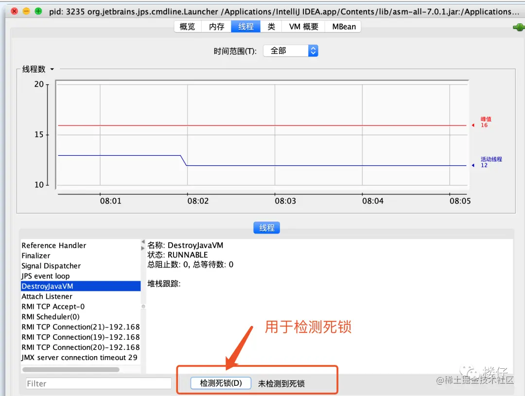 线程:相当于可视化的jstack命令,同时也可以点击“检测死锁”来检查线程之间是否有死锁的情况。