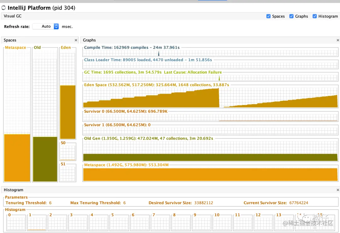 Visual GC 是常常使用的一个功能,需要通过插件按照,可以明显的看到年轻代、老年代的内存变化,以及gc频率、gc的时间等,感觉这个插件很酷!